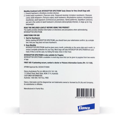 Interceptor Spectrum is especially important for preventing heartworm in dogs as young as 2 weeks old and offers protection against hydatid tapeworm, which can be harmful to humans. The tasty chicken-flavoured chews are highly palatable—94% of dogs enjoy them so much they’ll eat them straight from the hand!