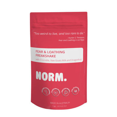 Get ready to embark on a wild and psychedelic adventure with Norm Fear & Loathing Freakshake, inspired by Hunter S. Thompson's iconic novel, Fear and Loathing in Las Vegas. This hot pink dream is a blend of freeze-dried crocodile, pink dragonfruit powder, and raw goats' milk powder, offering a unique and thrilling experience for your pet.