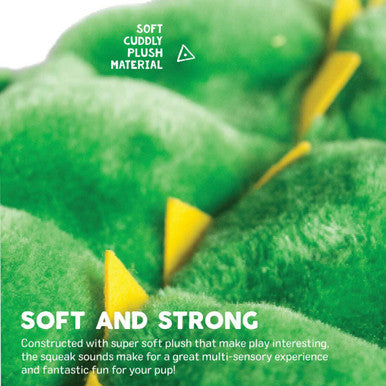 - Super squeaky crocodile plush toy with a bubble-wrap-like design.
