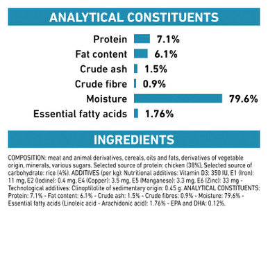 Meat and animal derivatives, cereals, oils and fats, derivatives of vegetable origin, minerals, various sugars. Selected source of protein: chicken (38%), selected source of carbohydrate: rice (4%).