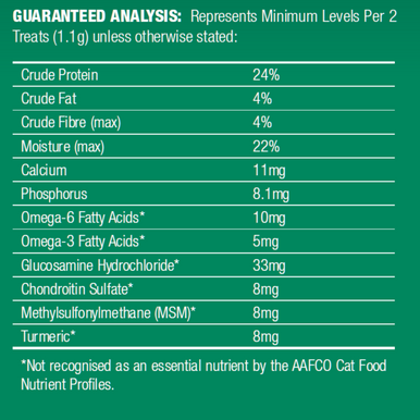 - Fast-acting joint care treats designed to promote bone and joint health in cats