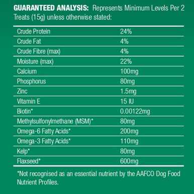 Australian Chicken Meal, Sweet Potatoes, Chickpeas, Dextrose, Chicken Fat, Natural Flavour, Ground Flaxseed, Sea Salt, Turmeric, Kelp, Pumpkin, Methylsulfonylmethane (MSM), Coconut Oil, Kale, Blueberries, Sunflower Lecithin, Glycerine, Vitamins (Vitamine E Supplement, Niacin, (Vitamin B3), Calcium Pantothenate (Vitamin B5), Riboflavin (Vitamin B2), Pyridoxine Hydrochloride (Vitamin B6), Thiamine Mononitrate (Vitamin B1), Folic Acid, Biotin, Vitamin A Supplement, Vitamin B12 Supplement, Sodium Ascorbyl Phosphate (source of Vitamin C), Vitamin D3 Supplement), Minerals (Zinc Sulfate, Ferrous Sulfate, Magnesium Oxide, Copper Sulfate, Manganese Oxide, Iodine, Sodium Selenite, Zinc Propionate), Sorbic Acid (a natural preservative), Taurine, Mixed Tocopherols (a natural preservative), Rosemary Extract
