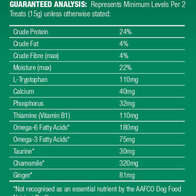 Australian Chicken Meal, Sweet Potatoes, Chickpeas, Dextrose, Chicken Fat, Chamomile, Ground Flaxseed, L-Tryptophan, Ginger, Essential Vitamins and Minerals and other wholesome ingredients.